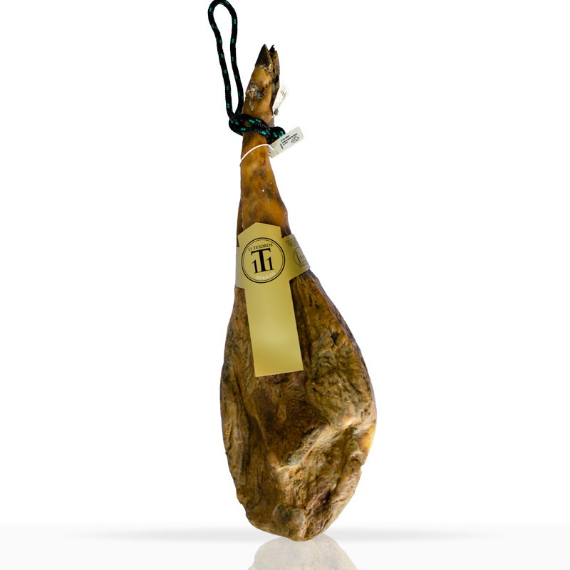 - Le Jambon Pata Negra Ibérique Cebo 50% de Race Ibérique «11 TESOROS IBÉRICOS», est fait à partir d'une sélection soigneuse des porcs ibériques nourris dans une zone d'engraissement avec des aliments naturels. Après un processus de séchage moyen de 42 mois, ils donnent naissance à un goût spectaculaire. Il est caractéristique pour sa texture très fine, son arôme incomparable, son goût intense et sa chaleur en bouche.