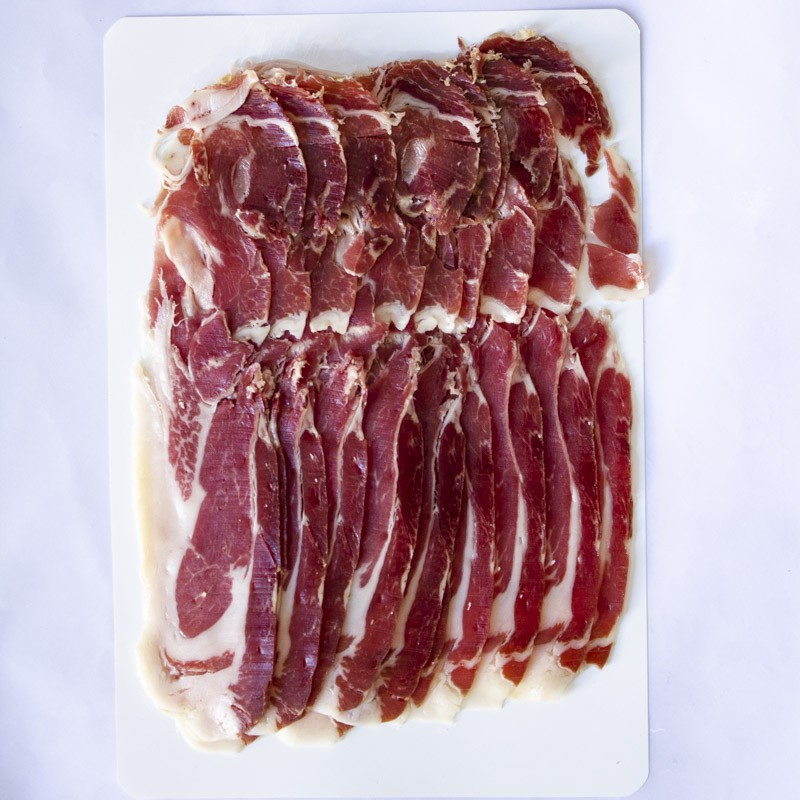 - Lopatka Iberyjska Cebo 50% Rasy Iberyjskiej "11 TESOROS IBÉRICOS" została opracowana na podstawie drobiazgowej selekcji świń iberyjskich żywionych na obszarze tuczu naturalną paszą. Po okresie kuracji srednio 30 miesięcy dają spektakularny przysmak. Charakteryzuje się bardzo delikatną konsystencją, niepowtarzalnym aromatem, intensywnym smakiem i ciepłem na podniebieniu. Lopatka pochodzi z przednich koñczyn swini iberyjskiej.